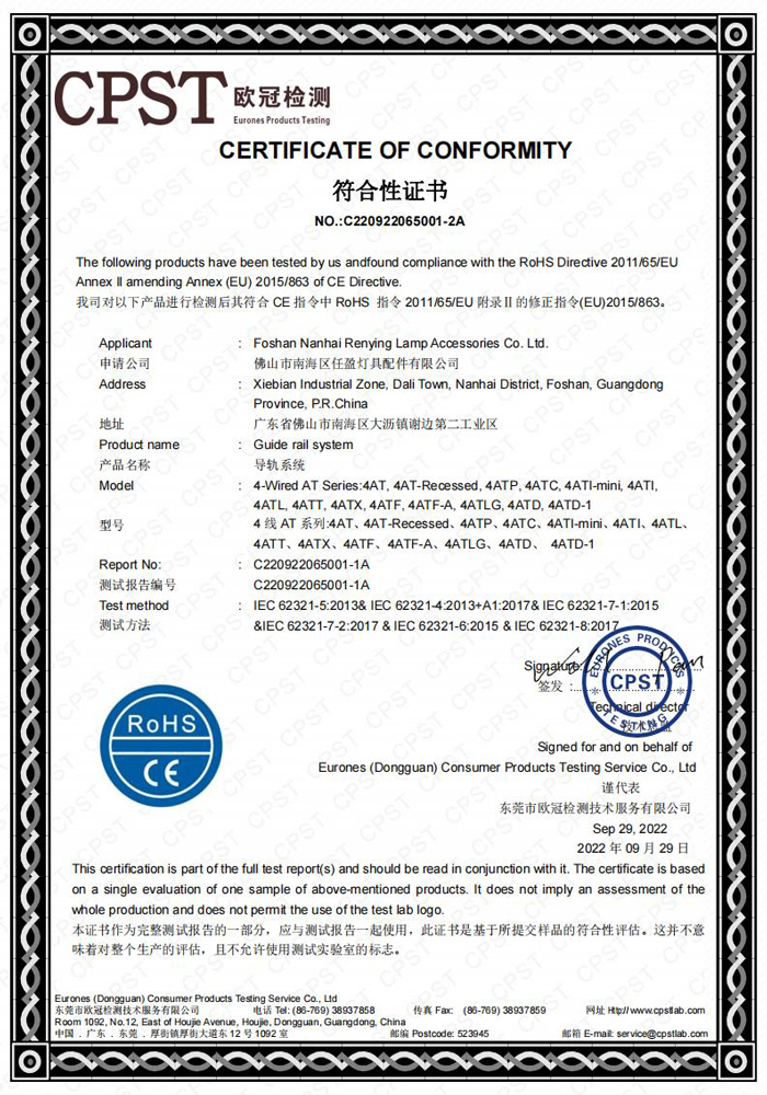Renying Lamp Accessories CO., Ltd as a professional manufacture, we pay attention to the effects of our products on human health. We concentrate on the manufacturing of environmental health and safety track system. All of our products pass the latest requirements of RoHS 3 (EU 2015/863).